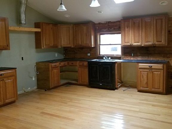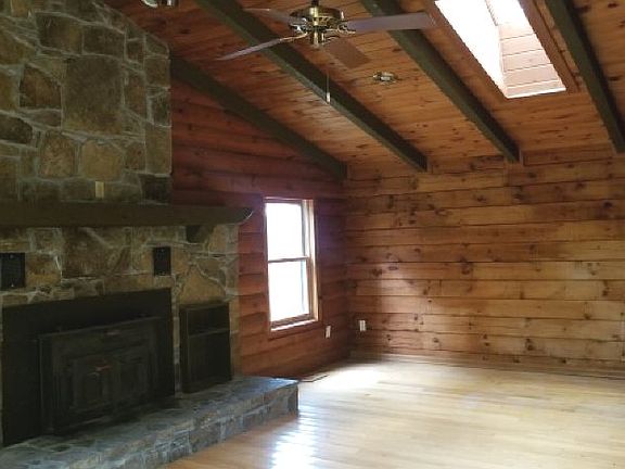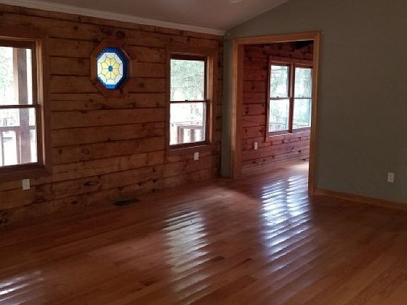 True lincoln Log Cabin. Spacious one floor living with over 2000 sq ft, rock fireplace, wood walls and floors. Very level 2+ acres with wooded lot with a detached carport/workshop. Newly renovated kitchen and baths. Logs recently stained and windows painted. New window screens, remodeled workshop, massage room and craft room. Attic storage in house and over garage. New combination locks on from and back doors. Newly painted bedrooms. Large storage area in basement with concrete floor. Large closet in laundry room/craft room. Attic fan. New roof on garage. Large skylights in family room and kitchen