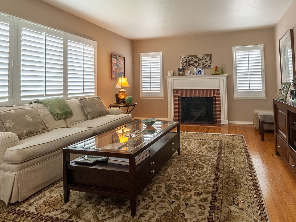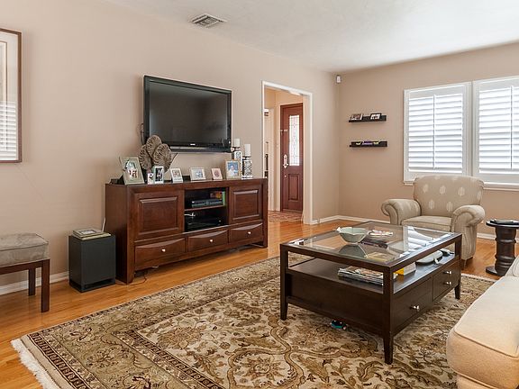 This adorable traditional 40's home has been lovingly cared for over the years and shouts pride of ownership. Amazing curb appeal. Front porch with with leaded glass lights in the front door. Gleaming original oak flooring. Large living room features a textured ceiling and a beautiful brick fireplace with carved wood mantle. Formal dining room with ceiling fan, hardwood floors, and a pass-through to the kitchen. Remodeled kitchen with quartz countertops, glass subway tile backsplash, stainless steel appliances, ceramic flooring, brushed nickel hardware, ample cabinetry, pantry, laundry closet and a door to the back yard. Two good-sized bedrooms, each with ceiling fans, newer carpeting, and "Hollywood" closets. The full bath has the original ceramic tile flooring with separate tub and shower. Large grassy back yard with brick patio. Plantation shutters, C/A & heat, some new plumbing, and a one-car detached garage. Pick up your furniture and move right in to this darling home!