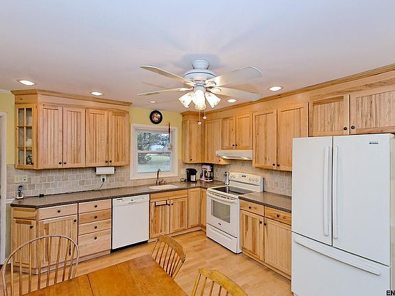 USDA ! 100% Financing Available ! Beautifully maintained & updated brick ranch set at the end of a quiet neighborhood with gorgeous views of the pond across the street. Feat.: updated baths, gorgeous custom hickory kitchen w/corian countertops, tile & wood floors, new roof, new large deck, spacious fenced in yard, 2 car garage attached , oversized shed, full basement . Total heat + electric $224/month. Total taxes $3840 !