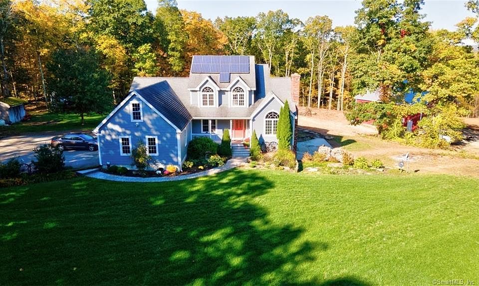 This property has 10.8 acres of privacy. A magnificent modern colonial, 3-car attached garage, a 30 x 48 spray foam insulated two story high barn with a 20' x 14' overhead door. The barn is on its own 200 amp meter. The in-ground heated pool has a new pool house. Landscaped lawn and walking/riding trails. This homes' amenities go on and on. Boasting 4 bedrooms plus a first floor office. Radiant heat in the primary bedroom located on first floor and new bath with a ceramic shower with frameless glass surround. There is also a private porch off the primary bedroom. The Thomasville Hickory Shaker style kitchen cabinets add to the clean look of this lovely colonial. Plenty of room in the family living room with a stone fireplace. The den has a gas fireplace with classic granite surround. The partially finished walk-out basement has a wood stove, sauna and plenty of storage. There are solar panels on the roof and an assumable contract. Level 2 EV charger in garage. Whether you enjoy a workshop, work from home or need plenty of space you will find it here. Enjoy a trail walk and relax in the hot tub or sauna. The property lends itself to a secluded resort feel with room for family and friends. Move in ready for a holiday to remember.