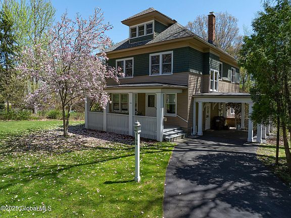 This beautifully updated Craftsman blends original charm with modern comfort. You'll love the welcoming front porch with swing, original woodwork, and built-ins throughout. The open first-floor layout features high ceilings, an updated kitchen, and a cozy family room with gas woodstove and picture window overlooking the wooded backyard. Upstairs offers spacious bedrooms and a walk-up attic for added living space. Set on a double lot with mature trees, a lush yard, and private trails, there's plenty of room to play or garden. Relax or entertain on the back deck. Just a short walk to Slingerlands Elementary and Five Rivers Nature Center—this one has it all.