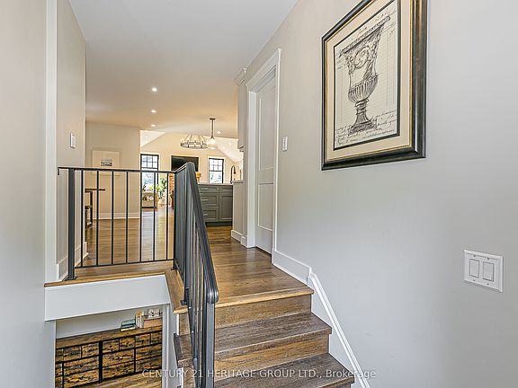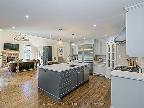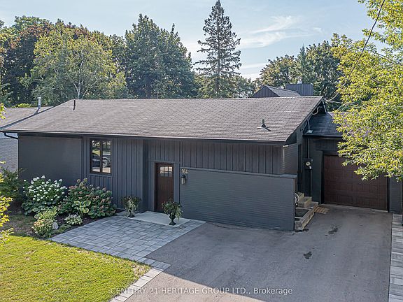 This impressive bungalow offers far more space than meets the eye and must be seen to be fully appreciated. The main level showcases a chefs kitchen featuring a Wolf 6-burner gas range, Sub-Zero full fridge and freezer, an abundance of cabinetry with polished nickel hardware, a walk-in pantry and a large center island with breakfast bar and stylish pendant lighting. The open-concept dining area is perfect for everyday meals or entertaining. The great room is stunning with its soaring 14.5-foot vaulted ceiling, cozy wood-burning fireplace and walkout to the back deck. The primary suite includes a walk-in closet and a spa-like ensuite with double sinks, a glass shower with rain head and handheld and modern finishes. A main floor office offers the ideal work-from-home space. The mudroom/laundry room impresses with built-in closets, a folding counter with storage and direct access to the driveway. A convenient powder room completes this level. Beautiful engineered hardwood flows throughout the main floor. The finished basement expands the living space with a large rec room, open office/den area and four additional bedrooms with large windows, as well as a 3-piece bath and ample storage. Vinyl strip flooring runs through the lower level rooms. Step outside to enjoy the private backyard, surrounded by mature trees and lush gardens. Entertain or unwind on the low-maintenance composite deck, gather around the patio which is the perfect place for a fire bowl or chiminea or relax year-round in the hot tub. Located close to schools, transit, and everyday amenities, this remarkable home combines comfort, style and convenience.