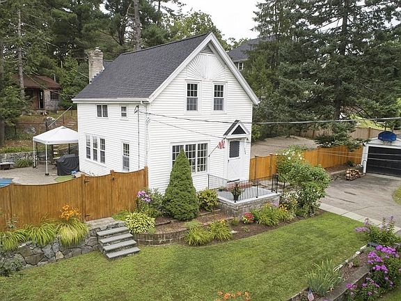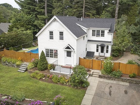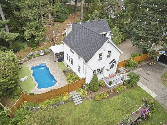 Welcome Home to this beautiful Colonial located in one of the most desirable areas of Reading! So many renovations and a newer addition make this home a gem! Kitchen features cherry cabinets, kick board heaters, granite counters with breakfast bar, SS appliances, and FP that open up to the dining room with a large bay window. The front to back living room has beamed ceilings and a wood burning stove in the fireplace and hardwood floors throughout. First floor also has a full bath. Upstairs boast a newer addition with large Master and two other good size rooms. Laundry is on second floor and in basement! Brand new bathroom with beautiful tiled shower and double sink. You can walk out from second floor onto a balcony that leads to the vaulted beautiful shed/cabin! The in-ground pool is a Next Generation fiberglass top of the line pool! Stunning tiled pavers surround the pool area. Sprinkler system in front of house. Detached one car garage. Private lot! Price to Sell!