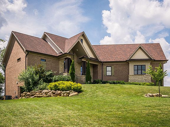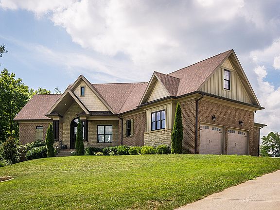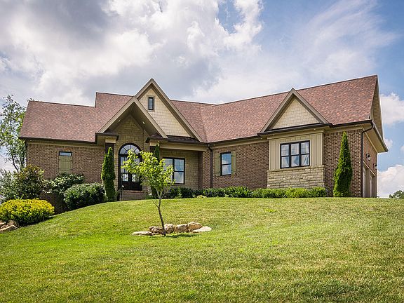 Welcome to 164 Persimmon Ridge..This 6 yo custom built Fusion French-country style home situated on .83 acre lot. This home has over 4,300 finished sqft, all brick and stone exterior, . You will find 10' ceilings on the first floor, with 8' solid core doors, The great room has coffered ceilings and a cozy fireplace. An open dining room with beautiful wainscoting and molding adjoins the great room. There is hardwood flooring in all rooms of first floor, except bedrooms (carpeting), baths (tile) and mud room (tile). The custom chef's kitchen has a huge center island for gathering and a spacious breakfast nook. There is an abundance of custom cabinetry, including a wine bar and impressive hood. The master bedroom has a vaulted ceiling with exposed beams and a large walk-in closet. The master bath features an oversized walk-in tiled shower with bench seat that i a show stopper! The split floor-plan puts the other 2 bedroom on the opposite side of the home, and they are joined by a Jack and Jill bath. The 2 car attached garage has additional space for workshop or extra storage. The huge mudroom will has custom built-in cubbies for storage and convenience. For those who need extra space, there is an additional 400 square feet in the attic area for a 4th bedroom or office. The lower level gives you 1,524 finished square feet that walks out to a lower level courtyard and patio. There are tall ceilings and a large family room (plumbed for wet bar), billiard room, powder room and 2 large finished rooms joined by a Jack and Jill full bath (similar to main floor bedrooms). There is still an abundance of unfinished space for storage and possible wine cellar. Persimmon Ridge is a lovely golf course community that features a neighborhood swimming pool, tennis courts, playground, fishing lakes and hiking trails. Golf membership is included with this home (buyer pays monthly dues if they choose to activate membership) Call listing agent for your showing today.