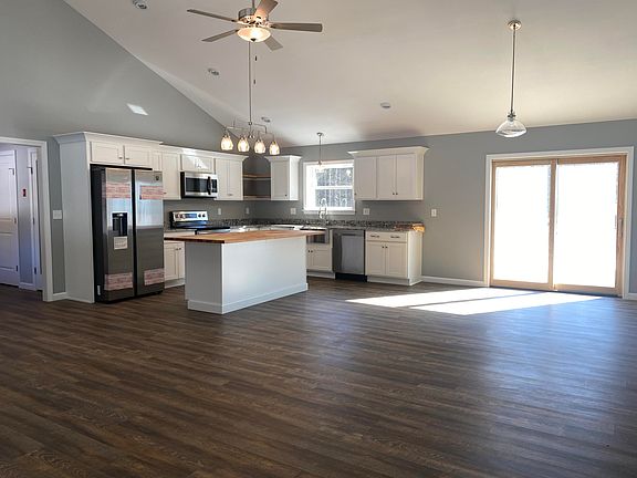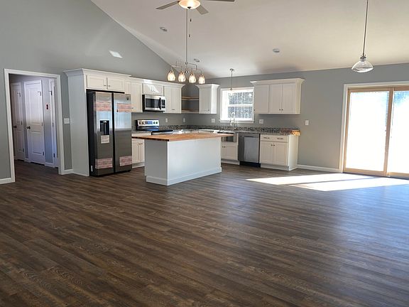 Gorgeous new built home on 1.8 acres 4 bedrooms, nice open living space to dining room, living room & kitchen with granite kitchen counters, pantry, butcher block island, radiant floors, two full baths with quartz countertops and Bluetooth speakers, 1st floor laundry, two car attached garage with overhead storage, and on demand hot water 24 x 30 garage, 46 x 8 covered front porch and 46 x 8 deck to the backyard.