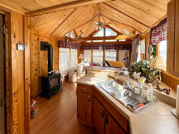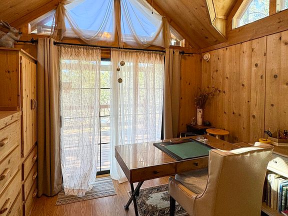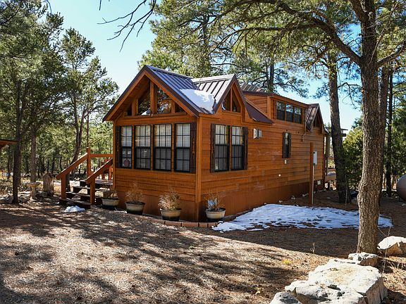 Charming mountain bungalow situated on a beautiful 1.47 acre lot bordering national forest. Quaint and efficient, with mountain ambiance - this home is waiting for someone wanting seclusion and simplicity. Floorplan offers a living area, kitchen, bedroom, bath & upper sleeping loft. Bedroom has sliding glass doors opening to a large deck. The land consists of 2 separately deeded parcels-all fenced and bordering the national forest. There's 2 large storage sheds and a well crafted 2 car carport. Enjoy morning coffee & watch the birds from the covered patio! *Home is not on a permanent foundation so will not qualify for conventional/FHA/VA financing