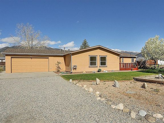 Enjoy remarkable views and an appealing location in this recently renovated manufactured home in the Westmoor subdivision, conveniently located on the west side of Buena Vista. Lovely front yard with bushes, shrubs, and lawn, plus walkway off the gravel driveway to a very nice front deck ideal for entertaining. This 3-bedroom, 2-bath home delivers a spacious floor plan of 1988 square feet, which begins with a lovely living room and formal dining room just off the front entry. The spacious kitchen has a large center island, freshly painted cabinets, a corner pantry, tile countertops, and huge views to the west, capturing Mt Princeton. Just off the kitchen is a great flex space and a bonus of a large family room with sliding doors to the fenced back yard with westerly exposure for fantastic sunsets on the back patio. Inviting primary suite with a five-piece ensuite and two closets on the north end of the home, in addition to the two additional bedrooms, full bathroom, and laundry room, round out this open and flexible floor plan. This home sits on a larger in-town lot with opportunity for gardening, an outdoor play area, and extra parking in the fenced back yard. With city utilities, an attached 2-car garage, easy access to downtown, and uninterrupted mountain views, this property is move-in ready, having just been freshly painted, with new flooring, furnace, and hot water heater.