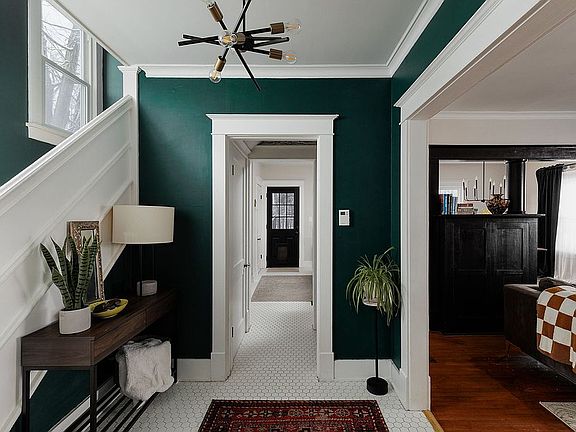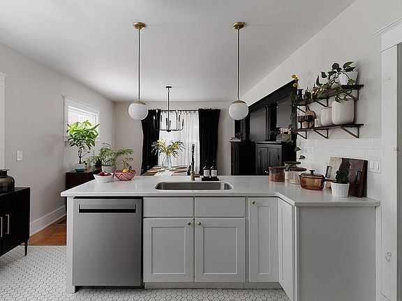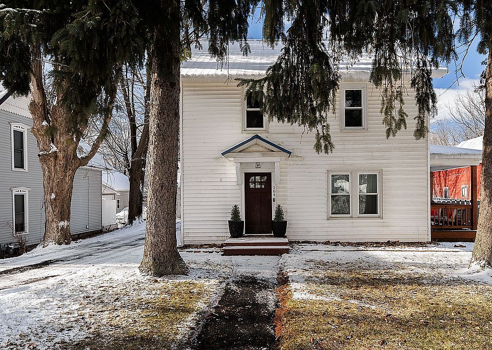 Beautifully renovated 3 bedroom 1 ½ bathroom home located minutes from Fort Drum! Built in 1945, this home has maintained its charm and character including crown molding, original hardwood flooring, the original staircase, doors, and more. Upon entering the home, there is a large foyer and closet boasting plenty of storage. The kitchen, which opens to the spacious dining room, has shaker cabinets, solid surface countertops, a storage nook that can be used as a coffee bar or butler’s pantry, and tile flooring. The dining room and living room are separated by original built-in cabinetry. There is a half bath on the main level. Upstairs you will find three bedrooms, a full bathroom, and laundry space. Two of the bedrooms have walk-in closets. This home has a detached two car garage, large 0.47-acre lot, and fenced in yard. There is a covered porch on the side of the house as well as a spacious patio in the back. It also has a large basement and walk-up attic for additional storage.