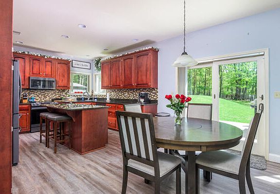 Large executive 4 bed 3 bath home on over 2 acres. New luxury vinyl flooring throughout the first floor with hardwood underneath. 42 inch cherry cabinetry in the kitchen with granite countertops & matching stainless steel appliances. Spacious family room with cathedral ceiling & gas fireplace. In addition to a large family room & kitchen the first floor boasts an office, formal dining & living rooms. Spacious primary en suite located on 2nd floor with Jacuzzi tub & huge walk in closet. All bedrooms are decent size with large closets. Full basement with a gym & large area perfect for a game/entertainment room. Home also offers central a/c, ceiling fans, attic & 2 car garage. No lack of storage in this house! Exterior offers large yard, deck, paved driveway & shed. Great Location! Home is located near prominent Pocono attractions, casino, shopping & major roads.