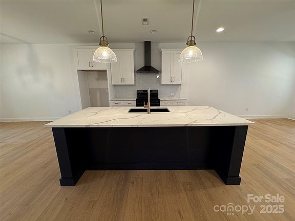 Inside, the open floor plan is highlighted by a stunning kitchen featuring an oversized island, a stylish range hood, and elegant quartz countertops that continue into the bathrooms. The main-floor primary suite provides a private sanctuary, complete with a tiled walk-in shower with double-hinged glass door, double sinks, and a spacious walk-in closet. The two additional bedrooms and a second full bathroom feature a tub with tiled walls to the ceiling, creating a luxurious and clean aesthetic. A dedicated laundry room with upper cabinets and a large pantry offer ample storage and functionality.