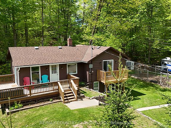 Bancroft - This adorable 2 bedroom home has a gorgeous view of Riddell Lake from the front of the house. No waterfront taxes to pay! Public access to the lake is close by. You can also walk directly across the road and put your canoe in the water. Property is located less than 10 minutes from town on a year round road. The house has had many recent upgrades in 2024 including new floors in the main area, some new windows, and ceiling fans. Main floor has an eat-in kitchen with an attached pantry, master with balcony, living room and 4 piece bathroom. Lovely deck off the front and side of the house for enjoying the view all day long. Walk out basement has an office, laundry room, second bathroom and a very spacious rec room with a kitchen. Perfect for a granny suite! Yard is surrounded by trees, has a gravel driveway and a 16' x 30' dog pen. Home is very economical to heat with both an oil furnace and electric baseboard heaters. Hydro approximately $170 per month and oil approximately $1500 for the year.