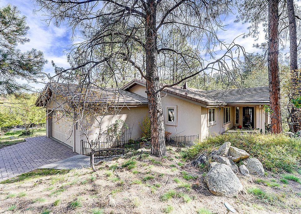 Beautiful updated home with adjoining level lot with fruit trees in the coveted, pine forested hidden Valley Ranch. This single level home features an open floor plan, natural light, and beauty out every window. Nicely updated kitchen with granite countertops, breakfast bar, hardwood cabinets, and large pantry. features beamed ceilings, stunning, hardwood floors, and heated floors in the kitchen and master bathroom. Absolutely lovely master suite with deck access, walk-in closet, and walk-in shower. A large deck wraps around into the Ponderosa pine, oak and Cottonwood trees with views of open space with a seasonal creek. Side deck has an electric awning with remote. Triple pane windows. Lots total .43 Acre with possibility of purchasing separately. Close and easy access to the national forest.