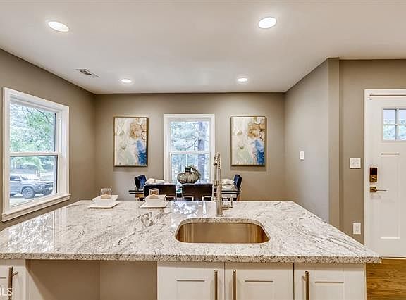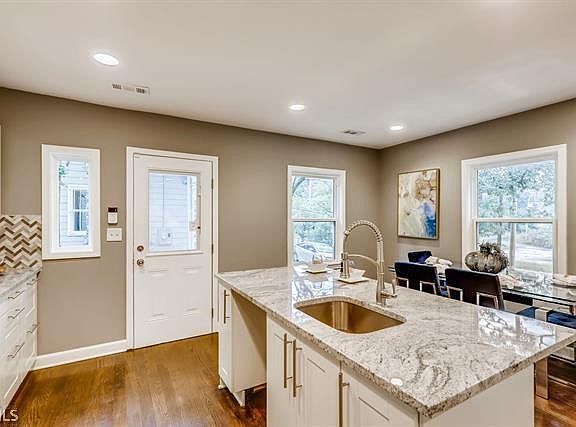 - Kitchen Features: Breakfast Bar, View to Family Room, Stone Counters, Kitchen Island, Breakfast Room, Cabinets White