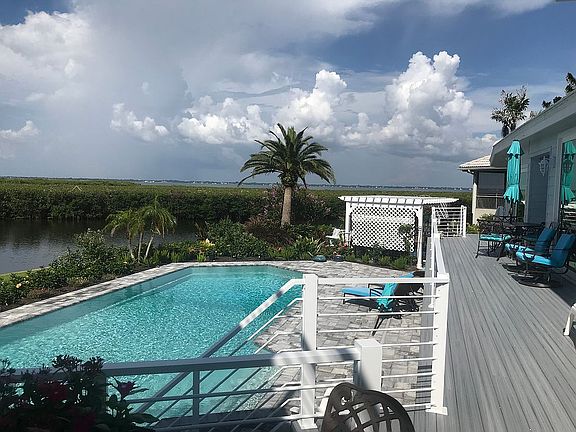 A PRIVATE WATERFRONT OASIS offers open & tranquil bayou & bay views. Completely rebuilt in 2020, the home stuns with a 10 ft high window wall fronting the view along the dining area and spacious living room. An open plan with a huge kitchen and spectaular 7x5 foot quartz island creates a wonderful space for family and guests. You can see dolphins and manatees from the interior of the home! A large private dock with two boat lifts and a smaller floating dock provides lifts for two boats and kayaks. With 197 feet of seawall, the water surrounds the house on three sides, opening to a harbor with sunset views. Deeded beach access to private pavilion with parking is a priceless amenity in this neighborhood and on this island.