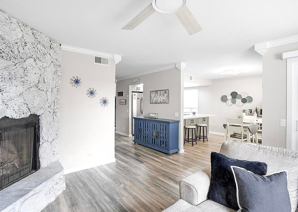 Welcome to Your New Home! Experience modern living in this stunning condo, ideally located in a serene private corner of the community. This spacious unit combines style, comfort, and convenience, making it perfect for your next chapter. Enjoy cooking in a beautifully updated kitchen featuring modern finishes, sleek countertops, and top-of-the-line stainless steel appliances. The open layout is perfect for entertaining! This unique unit is the only one in the complex with a charming fireplace, providing a warm and inviting atmosphere for cozy evenings at home. With a generous floor plan, the living and dining areas are filled with natural light, creating an inviting atmosphere for relaxation and gatherings. Retreat to comfortably sized bedrooms that offer ample closet space and tranquility, ideal for unwinding after a long day. This unit’s prime corner position ensures extra privacy. Community amenities offer a lovely area to soak up the sun by the poolside. Plenty of outdoor space to enjoy beautifully landscaped areas for picnics and leisurely strolls. Located near shopping centers, restaurants, and freeway, you'll have everything you need right at your doorstep.