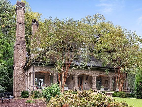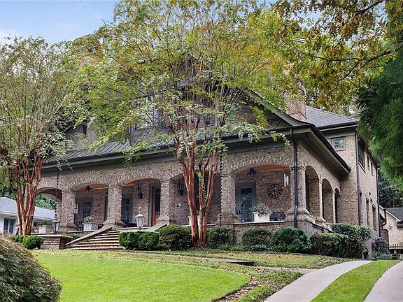 Tucked away in the heart of Atlanta’s Sherwood Forest neighborhood, this custom-built estate is a masterclass in architectural detail and refined living. Thoughtfully designed with layered materials and timeless finishes, the home blends old-world craftsmanship with modern innovation. A wide, deep covered front porch with tongue and groove ceiling, gas lights, and ceiling fans spans the front of the home—creating a gracious welcome and an ideal space for year-round enjoyment. Inside, generous open rooms flow seamlessly, designed for both relaxed living and entertaining. Both the formal dining room and the fireside office/library open directly onto the covered front porch through sets of French doors, enhancing the home's indoor-outdoor connection and providing an exceptional entertaining flow. Custom leaded-glass doors close off the library for quieter moments by the cozy fireplace. A dramatic two-story foyer with an imported Italian tiled ceiling and Turkish terracotta flooring sets the tone for the home’s timeless details. Seven fireplaces—each capped with custom stone and brickwork that mirrors the banister finials—anchor the home with warmth and artistry. Beamed ceilings, hardwood floors, and finely crafted millwork add depth throughout. The main kitchen is outfitted for serious culinary work, featuring dual refrigerators, dual dishwashers, a butler’s pantry, three sinks, and bespoke cabinetry. A second full kitchen on the terrace level adds versatility for hosting or multi-generational living. The main level also features a secondary primary bedroom suite—ideal for guests or those seeking one-level living. Upstairs, the primary suite is a true retreat, with vaulted ceilings, an oversized walk-in closet with space for a private office or dressing lounge, and a beautifully tiled bath with fireplace—creating a serene and luxurious atmosphere. Also on the lower level: a 1,000+ bottle wine cellar with tasting room, a fireside entertaining lounge featuring a generous fireplace and a stunning original bar—meticulously reassembled on-site after being imported from Europe—a fitness suite with separate laundry and a river stone steam room that fits eight, an office, and flexible space for media or games. The fully updated Control4 system provides intercom, security, and whole-home sound through an integrated speaker system. An elevator serves all levels. Outdoors, a brick loggia with a built-in pizza oven and gas grill overlooks the private, gated backyard and pool—perfect for entertaining or unwinding in total privacy. A whole-house generator provides comfort and peace of mind throughout the seasons.