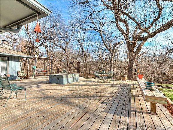 Beautiful home situated on more than 2 acres in quiet neighborhood. Peaceful and private wooded backyard backs up to creek. The large bonus room could be used as 2nd living or bedroom. Large living room featuring gas log fireplace and open to formal dining area. Kitchen features double ovens, gas cook top, fridge, pantry and eating space. Huge Master bedroom also has a gas log fireplace, sitting area and built in desk. Master bath with double sinks, walk in closets, jacuzzi tub. All secondary bedrooms are large with access to bathroom, Enormous laundry/mud room with closet and half bath. Wood flooring in kitchen and eating area. Plantation shutters and fans through out home. Enjoy spending time on the giant wood deck or in the hot tub. 3 car garage is heated. Exterior offers Underground storm shelter, sprinkler system, storage shed and extra parking.