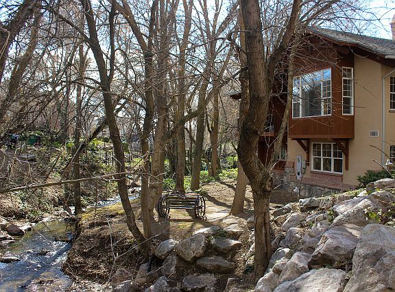 - landscape: Pines, Terraced Yard, Scrub Oak, Landscaping: Full, Mature Trees, Stream, Waterfall