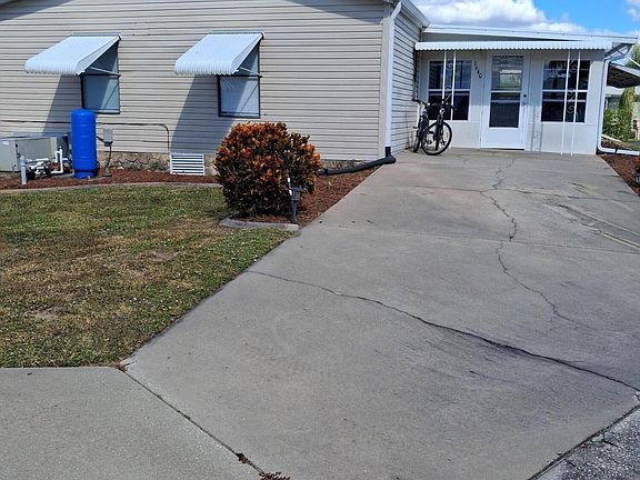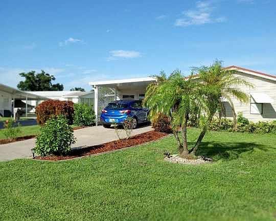 SEMINOLE COVE 2/2 Furnished with 2 Master suites and all appliances. NO STEPS to go into home. 2 entrances with driveways on both sides. Both entrances lead to front porch. Relax or read a book and enjoy the Florida weather. Large living room and open concept to dining area. Inside laundry area. Both master suites have large closets, bathrooms & ceiling fans. Home has a metal room and storage room. Corner lot and landscaped with fruit trees and center island. Seminole Cove is a 55+ community with a heated swimming pool, large clubhouse, fish cleaning house, shuffleboard court and many activities to keep busy. Gated at dusk for security, Measure rooms for accuracy