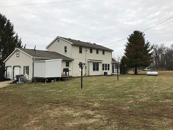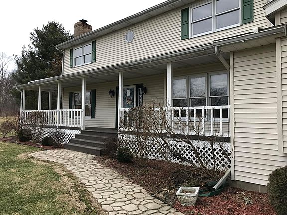 Unique opportunity to own 7.58 partially wooded acres in convenient location for a commuter & just minutes from town. This colonial style property has 3 bedrooms & 2.5 baths with just over 2,000 sq ft & additional full, partially finished basement for additional living space or for whatever your needs may be. Nice size living room with brick WB FP w/stove insert & open to your formal dining room. The Eat-in kitchen has tons of space & potential. 1st floor laundry & half bath. Master BR with walk-in closet & private bath. 2 car attached garage with an additional 20x21 pole barn & storage shed. Enjoy the views from your covered wrap around porch or explore the trails in the woods. House does need some updates & cosmetic work, but is ready for someone to come make their own.