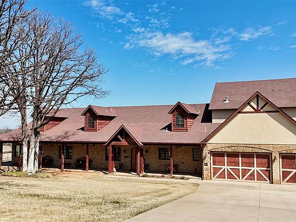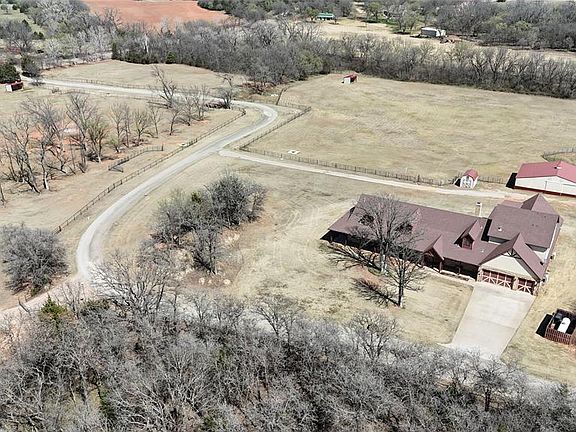 Welcome to this exquisite ranch property, perfectly nestled on a sprawling 16.98-acre estate. Boasting 4 spacious bedrooms and 5 luxurious bathrooms, this home offers a generous 4912 square feet of elegant living space. High ceilings and large windows create an inviting ambiance, highlighted by a cozy fireplace that promises comfort and warmth. The interior showcases a blend of rustic and modern elements, with standout features like wooden ceiling beams, decoratively stained and polished concrete floors, and large windows that flood the rooms with natural light. The master suite impresses with a walk-in closet, ensuring plenty of storage. Venture upstairs to discover a large bonus room complete with its own bathroom and kitchenette, perfect for guests or a private retreat. Equestrian enthusiasts will fall in love with the property's barn along with the adjacent round pen for training. Whether you're entertaining or simply enjoying the serene surroundings, this residence offers unparalleled peace and privacy. The living areas are spacious and open-plan, with a stunning great room that combines living, dining, and kitchen spaces under 18' vaulted ceilings adorned with decorative lighting. The kitchen appears well-equipped with modern appliances and ample counter space. Throughout the home, warm wood tones in doors, trim, and cabinetry create a cohesive, inviting atmosphere. The animals' oasis is equipped with a concrete floor, 4-stall barn and large barn doors on the east and west sides. Seller is offering the property furnished if Buyer is interested and is related to the Listing Broker and Listing Agent who are licensed with The Oklahoma Real Estate Commission in the State of Oklahoma. Seller is highly motivated. Please submit any/all offers.