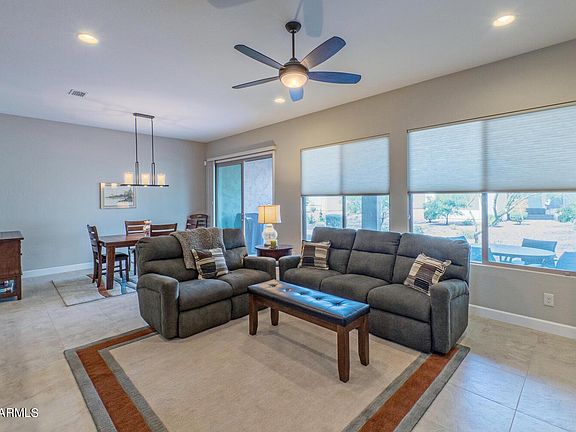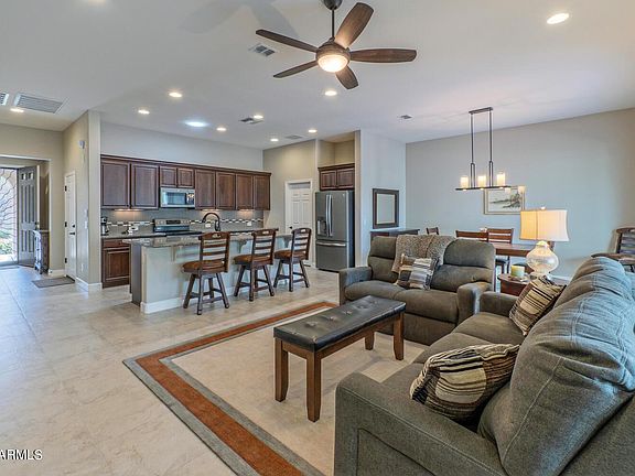 Impeccable Lock & Leave Villa. Bring your suitcase; this furnished villa is ready for you to move in and enjoy the resort lifestyle now! Lightly lived in. This home is in almost new condition. Kitchen upgrades include upgraded cabinetry with roll-out shelves, granite counters with full decorative tile backsplash, closet pantry, appliances are the popular Slate finish: smooth top electric range, built-in microwave, & dishwasher. Spacious Master Bedroom. The master bath has double sinks, large shower with bench seat, & walk-in closet. Spacious laundry room has extra cabinets; washer & dryer stay with home! Neutral tile floors & carpet in bedrooms. Additional upgrades include upgraded window coverings, ceiling fans, & water softener. Why buy new & wait? Ready to enjoy now!
