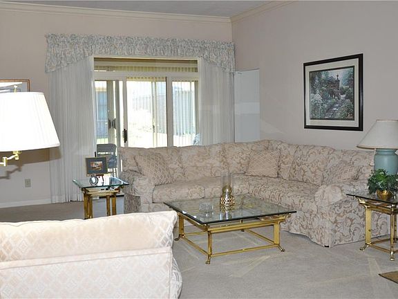 Original owner home has been well maintained. Carpeting 2 years old. Seller's contractor just finishing up painting where wallpaper in kitchen, dining room and laundry was removed. This is a 2 bedroom with a lovely den that offers built in shelving and french doors. GR has a gas fireplace with blower for cool days along with more built in shelving. Master bath has double sinks, large marble tub and separate shower. Sun room could be used most of the year. Large eat in kitchen. New plantation shutters! Sprinkler system in front, back and one side. Newer cement siding.