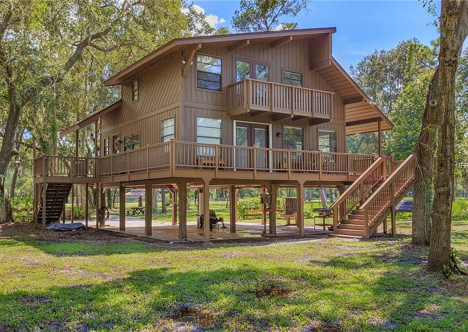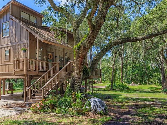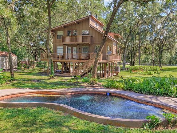 "Chalet on a Creek" best describes this 3/2 immaculate pool home on the Itchepackesassa Creek. You'll be inspired to upload the beautiful interior photos to your Pinterest faves! Situated on a picturesque 1.2 acre yard with 150' of creek frontage with a "zen garden" ambiance. 1st level of the home offers 4 covered carport spaces that is perfect for storing autos, boats, ATV's or your favorite "toys". Entering the 2nd level main living area you'll love the natural lighting offered by multiple french doors that showcases the exposed beam ceilings with open floor plan and warm glow wood floors. The renovated kitchen will sweep you off your feet with it's premium solid cherry cabinetry, quartz cabinetry, & state of the art appliances. Warm your toes on the gorgeous slate floors equipped with radiant heat- no slippers needed! Interior lighting upgraded to LED for energy savings with "SMART" controls. 3rd level contains all bedrooms & master bath. Master suite features exposed ceiling beams plus renovated master bath with quartz vanity & custom Euro style glass enclosure. Dual french doors in master suite offer great views of the back yard, pool, creek, & access to the balcony deck. Enjoy the outdoors as much as the indoors while working on your favorite hobby in the 12'x24' detached workshop. Store your gardening equipment in the 12'x16' detached shed. NO HOA or CDD fees. Conveniently located less than 15 minutes from shopping mall, restaurants, hospital & I-4 access offering easy commutes to Tampa or Orlando.