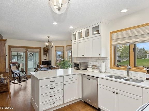 The condo you have been waiting for! Sparkling end unit with the best floorplan - two bedrooms and two full baths on main floor, and a third bedroom with full bath in sunny walkout lower level. Spectacular, Surroundings designed custom kitchen: white cabinets, quartz counters, pull out pantry, built-in microwave, stainless hood fan, double oven, french door refrigerator and coffee nook. Wonderful, sunny bay window in breakfast room to three season porch with skylights - all overlooking neighborhood pond. You will enjoy the upgraded and updated primary bath with walk-in hand tiled shower with bench and double sinks with quartz counters. The living and dining room feature soaring ceilings, gas fireplace flanked by windows and real wood floors! The walkout lower level boasts a finished family room, bedroom & bath and storage & hobby area. Newer roof 2017, some new windows, custom shades and blinds, stainless kitchen appliances 2021, main floor washer & dryer, spacious two car garage and storage. Great neighborhood with quiet, private streets, close to shopping. Immediate possession.
