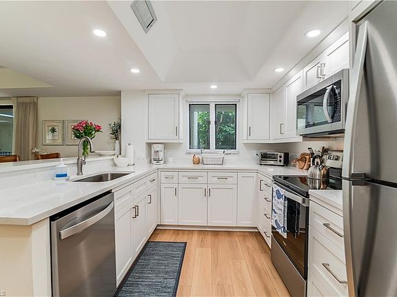 This meticulously designed 2-bed, 2-bath residence, is perfectly situated in the coveted Naples Bath & Tennis Club neighborhood, a mere 2.2 miles from the pristine Naples beaches. This is the most desirable "split" floor plan and is perfect for families and guests. This building features an elevator, providing convenient and efficient access to upper floors. Rest assured with the strategic positioning of this condo outside the flood zone. Immerse yourself in the exquisite transformation of the entire home, where modern sophistication seamlessly meets timeless elegance. The kitchen, a culinary masterpiece, features quartz countertops and all-new appliances catering to the discerning chef. The full renovation includes luxury vinyl planking layered over an acoustic flooring system. This turnkey condo invites you to bring only your suitcases, offering a hassle-free transition into the epitome of paradise. Your four-legged family members will also love the lush green spaces and walking paths throughout the community. Elevate your lifestyle with this modern and luxurious lakefront haven, where every detail has been thoughtfully curated for a truly exceptional experience.