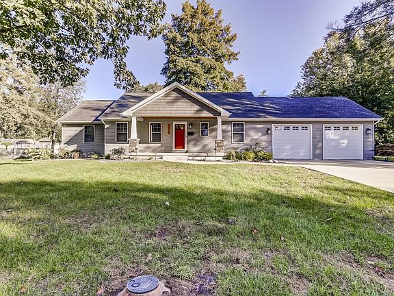Convenient location in this 3 year new ranch on extra large lot. Quality throughout and custom built with all the extras including rich hickory hardwood flooring sprawling into great room, gorgeous kitchen w/custom Hickory cabinets, granite tops, center island, pantry, SS appliances leading to covered patio and huge backyard with 2 car detached garage converted to workshop. 3 bedrooms, 2 full baths boasting quality built hickory cabinets, beautiful master suite with dual headed shower, granite two bowl vanity, and WI closet. Full basement with 9 ft. ceilings, partially framed for 2 bedrooms w/2 egress windows, shower already in place, and large laundry room. Deep (650 sq. ft.) 2 car attached garage with epoxy flooring. 186 schools. Professional landscaping with border magic is completely maintenance free.