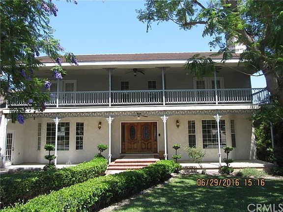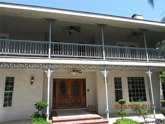 Beautiful custom tri-level home with new carpet & paint, tennis court, basketball court & RV parking is ready to be yours! Plantation style porch w/ dual door entry welcomes you into foyer with grand winding staircase. Sunken formal living room w/ fireplace, sunken formal dining room w/ custom chandelier, family room with fireplace and wet bar. Entry has main floor bedroom and private full bathroom. Expansive kitchen has built in appliances and sliding door to covered balcony with ceiling fan for al fresco dining. Head upstairs to top level to enjoy your luxurious master bedroom retreat with fireplace & French doors leading to covered balcony. Private master suite has walk in closet, dual sinks, separate shower and relaxing soaking tub. Bonus loft with powder room, plus Jack and Jill bedrooms one with private balcony, dual sinks & full tub at bathroom. Head down to lower level to an additional bonus room and full bar, plus 4 more bedrooms & full bathroom w/ shower in tub. Outdoors enjoy your privacy surrounded by orange groves and lush bougainvillea vines. Completely fenced pool & spa is waiting to be enjoyed. Huge rear covered patio, large spacious laundry room with built in desk, 4 car garage, additional guest bathroom at laundry room & more!