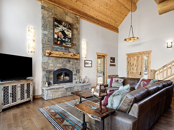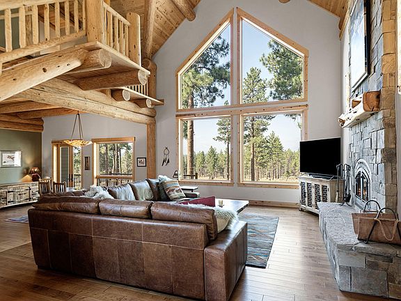 A custom built, luxury oasis in the pine trees. Revel in end of road privacy as you take in the views from this stunning, staggered beam constructed home with luxury finishes. Home thoughtfully features local artists' custom work: Zeitner glass light fixtures/ Skip Armstrong carvings. Dining/kitchen/primary wing all have 12 ft ceilings. Main level primary with spa like bath has access to deck, hot tub and views. Upstairs features 2 bedrooms, 1.5 baths, flex area (could be gym, studio, etc). Lounging loft area w/balcony, wet bar and more views! Covered outdoor entertainment area with fireplace, tv hook up, and extensive decking. Paved, circular drive. Custom, glass greenhouse w/raised planting beds. RV garage with power/water/dump. HOA includes access to trails, picnic area and Wychus Cr.