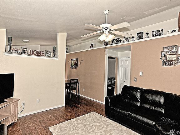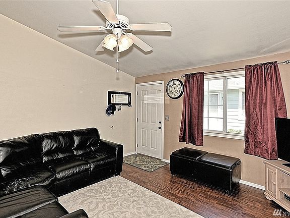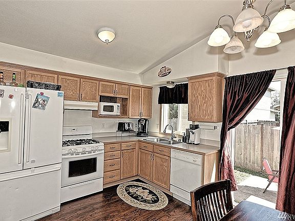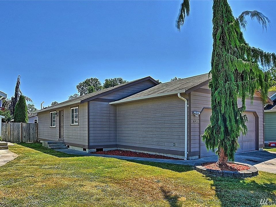 Excellent location, conveniently located off of I-5. This 3 bedroom 1 bath rambler offers a great floor plan with vaulted ceilings, newer laminate floors, doors, trim and updated bathroom. Cute kitchen with eating space has a slider that opens up to a patio and fully fenced easily maintained backyard.Large two car garage with work cabinets. Community offers walking trails and parks. Located near all amenities!