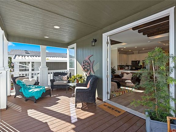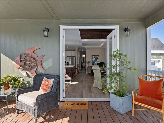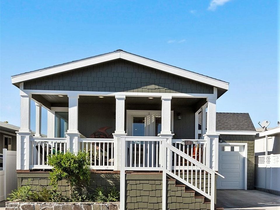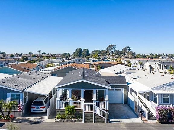 Welcome to the coastal living of "Surf City" in Huntington Harbour Village. This is a manufactured home "Senior" condominium community where residents own the land. No space rent! And less than 2 miles from the beach! Come see this beautiful new model - down the street from the card room clubhouse. It is a quaint 2 bedroom "Cavco" built home. Have a get-together enjoying the large front deck or spill into the great room with 9' ceilings, an open concept kitchen, bar height counter, and dining area for your guests. Tall 8' doors give a majestic feel to the home and the coffered w/beamed ceiling brings a richness to the surroundings. In a great location with "garagette," and automatic garage door opener, room for 2 cars, and additional space in front. Your wonderful single level living is here! The main community clubhouse has a caterers kitchen, community pool, spa, sauna, exercise room, putting green, BBQ area and pool table/game room. The small clubhouse/card room has an outside fire pit for small group entertaining. RV storage space for rental on-site. This is a 55 & older community... The rules state one person residing in the home must be 55 or older and the other can be no younger than 45 years of age. (Per HOA's written rules). This is a beach-close community with low HOA's near the harbor, park, shopping, restaurants, and beaches.