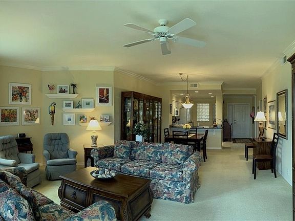 Immaculate first floor 2/2 "Windsor" golf condo with spectacular views of the golf course & lakes! Lovely home features crown molding in the living & dining areas, specialty hurricane impact windows, & a newer 14 seer A/C with a lineset. 2015 kitchen has Cambria countertops w lowered breakfast bar, newer hardware, cabinet doors, drawers, built in cabinet in breakfast area, 2015 microwave, refrigerator and disposal. 2016 Master bath features a raised vanity, Cambria countertop, new mirrors, lights, shower door & comfort height toilet! Guest bath has newer granite counter tops & hardware! Large lanai is tiled and features early morning sunrises! Condo is selling fully furnished minus electronics. Building and carport roofs are all being replaced! Golf membership, fees apply.