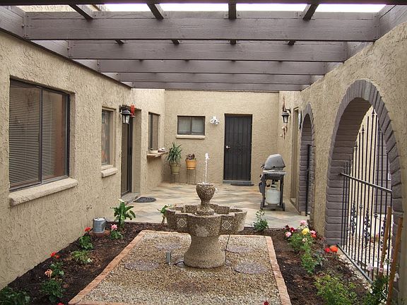 Large split floor plan Santa Fe style house with ability to turn off AC/Heatpump on one side and still use the master suite, LR, DR, Kitchen in comfort when you don't have house guests. Hybrid water heater sits inside the laundry room so it provides extra cooling for that room. Grid-tied 24KW PV solar co-generation provides more electricity than this house can use. Get paid for surplus power. Pool resurfaced in 2013 - pebble sheen with updated cleaning system, new tile, new cool decking, new light, new pump and motor. Kitchen, Laundry, Bar remodel in 2015 with solid maple custom cabinets and many extras such as dual flatware drawer, trash bin cabinet, baking pan vertical drawer, pot and pan pull-outs, additional pantry cabinet, LED lighting, updated skylight well, Corian counter tops, built-in corner desk in dinette area, wine glass rack at bar, stacked washer/dryer for more laundry storage space. New foam insulated double wall steel garage door and updated openers/motor in 2017. New interior doors, new windows throughout, replaced sliding doors with French doors, replaced all original tiles (20x20) with large wood plank ceramic tile. Remodeled all bathrooms -- removed sunken tub and small shower in master and replaced with large double shower, updated contractor grade shower in guest bath to a soaking tub with shower, upgraded the original half bath to full with twin rainfall shower heads and glass shower doors. All bathrooms have new cabinets and Corian counters and ceramic undermount sinks. All toilet and shower and tub areas have 100% tile walls floor to ceiling. New wall mirrors have tile surround decorative framing. All light fixtures replaced and all new copper plumbing in the three bathrooms. No plastic pipe anywhere in this house.