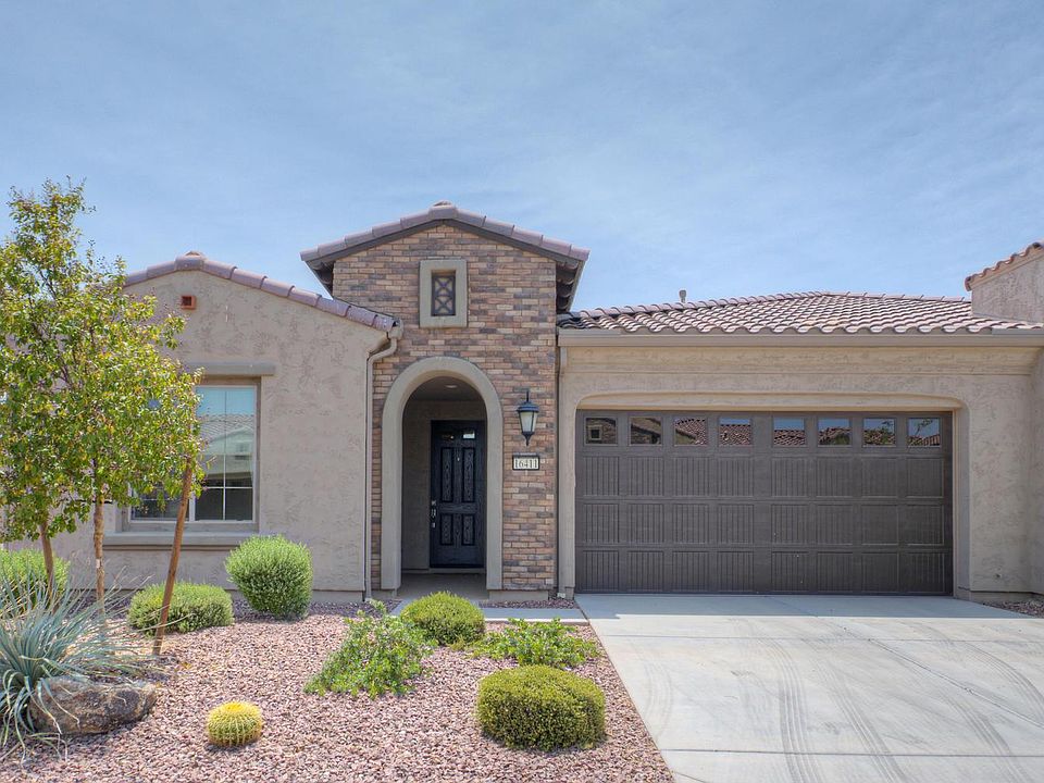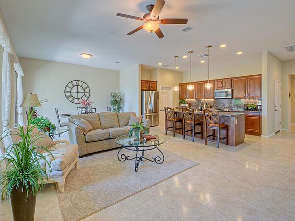 Impeccable Lock & Leave Villa. Superior location: South facing back yard with covered patio & fence offers privacy; perfect place to soak up the Arizona sunshine! Kitchen upgrades include upgraded cabinetry with roll-out shelves, granite counters with full granite backsplash, closet pantry, pendant lights above kitchen island, STAINLESS STEEL appliances: smooth top electric range, built-in microwave, & dishwasher. Spacious Master Bedroom. The master bath has double sinks, large shower with bench seat, & walk-in closet. Spacious laundry room has extra cabinets & utility sink; washer & dryer stay with home! Stunning tile floors & carpet in bedrooms. Additional upgrades include cellular window coverings, ceiling fans, & Nuvo(r) water softening system. Why buy new & wait? Ready to enjoy now!