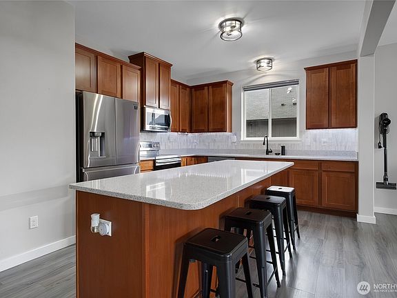 Stunning updated rambler featuring a spacious great room w/vaulted ceilings. Updated kitchen boasts oversized island perfect for entertaining. Primary suite offers true relaxation with backyard access, 5-piece ensuite bathroom. Newer interior paint, flooring, quartz counters, sinks/faucets, lighting, tile backsplash & ceiling fans throughout give this home a crisp, move-in-ready feel. Enjoy year-round comfort with A/C & unwind outdoors on the private patio. The spacious 3-car garage provides plenty of parking, storage & convenience. Modern finishes, thoughtful upgrades, & one-level living at its best. Close to schools, shopping, parks, and JBLM. This home combines comfort, style, & functionality!