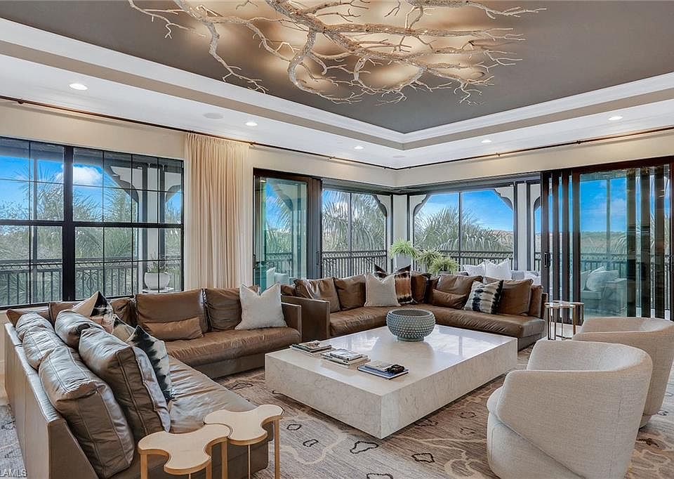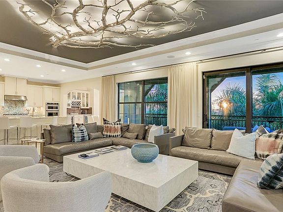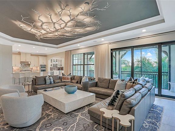 END CORNER unit with western sunset exposure views. Like new, WCI award-winning Carrara model is move-in ready. Unit showcases Judith Liegeois Designer custom Venetian plaster with matching custom Venetian entertainment center, wall to wall cashmere drapes designer chosen fixtures throughout and drop down Kevlar storm smart screens. Enjoy lake and golf course views from the vast outdoor living area in a community accented with waterfalls, stone bridges and organic citrus trees. This spacious unit offers plentiful natural light, modern decor and resort-style living. The well-thought-out, open floor plan offers graceful flow from the living area to the kitchen and dining areas. The master retreat offers a large bathroom with a soaking tub, dual sinks and plentiful closet space with California built in closets systems. Carrara in Talis Park offers its own pool, spa and outdoor grill, just steps from your doorway. Talis Park showcases award-winning amenities and is just a short distance from downtown Naples' fine dining, world-class shopping, entertainment and white-sand beaches.