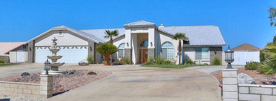 Beautifully Maintained Custom-Built Home in Apple Valley, 4 bed, 3 bath, pool with diving board, spa, gas fire pit with large half-moon sitting wall, luscious park like landscape with timer lighting (remodeled 2018) and sprinklers/drip system, water fountains, block wall (timer lights) and rod iron gates, large covered patio, stamped concrete walkway, round concrete table with seating for 6, front courtyard, censored front lighting, all complete with a panoramic view of the valley and mountains. Decorative rock on front of home and pillars. Equipped with an alarm. Large tile entrance with mosaic medallion, gas fireplace with wood inserts in living room and master bedroom, lots of storage, built in shelving and custom cabinets. Island kitchen, granite counters with backslash, triple bowl sink, double ovens and large pantry. Game room with gorgeous views. Living room wired for TV and surround sound. Huge master bedroom with walk-in closet and tall sliding mirrors, master bath with double sinks and vanity, separate shower, garden tub, and commode room. Walk-in closet in guest room. Custom closet shelving in 2 guest rooms. Cabinets with lots of indoor storage, carpet/tile/laminate flooring, ceiling fans and plant shelves throughout. Indoor laundry room with lots of cabinets and tiled counter top. Central heat/air and new swamp cooler with separate ducting throughout home. Oversize 3-car garage with cabinets and 220-volt outlet, side RV/boat parking, circular drive, shed on cement foundation, house and pool solar. Attic access from garage with full storage area. Both garage doors recently replaced, one with a new Master Lift garage door opener that can be activated anywhere from your wireless device. Safe, quiet neighborhood, upscale living with plenty of areas to recreate, shop, and golf, close to freeway. Wheelchair accessible. One owner. A must see to appreciate...Hit Attached Docs to view house features.