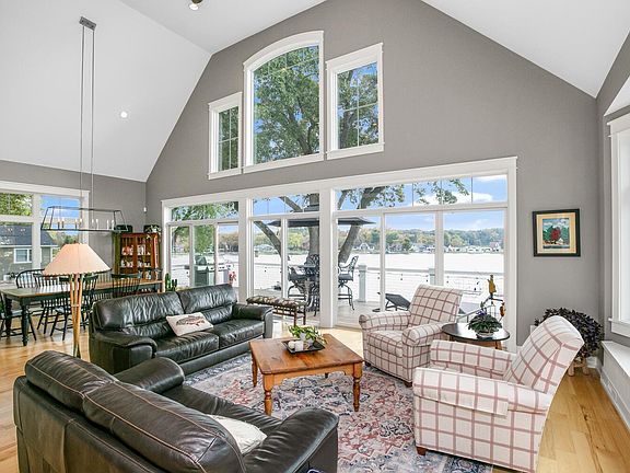 5 BD 3.5-BA, 4,382-sq-ft ( plus 1 BD 1 BA carriage house), 1-owner 6-year-old home, .28-acre lot north side all-sports, spring-fed Donnell Lake, magnificent sunrise, sunset, nature views. 60-foot waterfront w/ new 80-ft aluminum pier, cement seawall, new terraced stone patio w/ firepit. Main level: living area w/ panoramic views, vaulted ceiling, wood floors, deck access; kitchen w/ large island w/ black walnut top, bar seating, stainless appliances; TV room w/ deck access; laundry; powder room. Upstairs: primary BD w/ loft view of lake; primary BA w/ garden tub, tiled standup shower, heated floor; office/BD; BD; BA. Downstairs: living area w/ heated floors, covered patio access; kitchenette; dining; bar/kegerator; BD; exercise room/BD, BA. Backlot 9-year-old 840-sq-ft carriage house: 2-car attached garage; living/kitchen/dining area; BD w/ upper deck access; BA/mudroom. 2-car attached garage; Generac generator; security, camera, Sonos systems; well irrigation system; new gutter guards. Turn Key with acceptable offer.