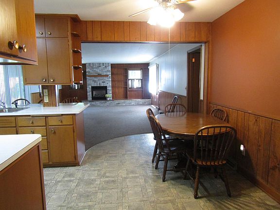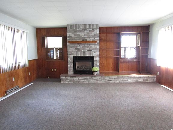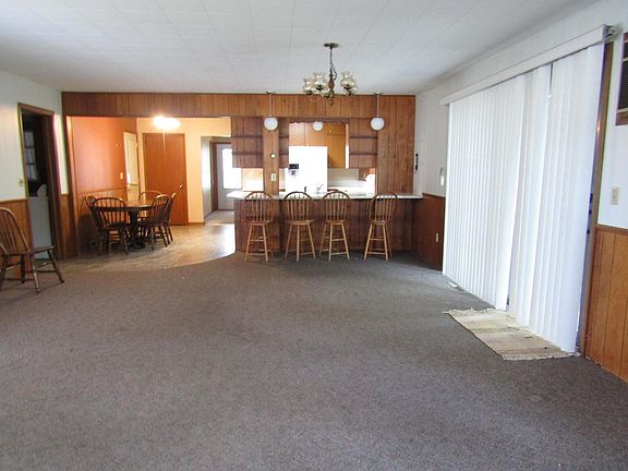 Plenty of space for entertaining family and friends in the huge family room that is open to the kitchen! Just imagine your Christmas gathering with a tree by the cozy fireplace, Thanksgivings in the open family/dining room/kitchen and entertaining in the summer on the patio right outside the patio door from the dining area. Home is on large double lot. Eat-in kitchen has a breakfast bar, includes stove, refrigerator, dishwasher and is open to the dining/family room. There is a living room, 3 bedrooms, a 3/4 bath, laundry room and another 1/4 bath on the main floor. Basement has another family room, three additional bedrooms, 3/4 bath, a second kitchen/mechanical room, and a shop. An attached garage also has a workshop area. There are two furnaces. The south one was installed in '90 and the north one in '22. Circuit Box updated in '22. PVC line installed to the street. Storage shed in back yard. The small cabin on the extra lot is not included and will be moved.