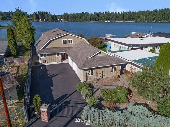 Exceptional Lake frontage with privacy. This home maximizes the lake views from virtually every room. Downstairs features an owner's bedroom with a 3/4 bath. Additional downstairs bedroom sports double bi-fold closets and a walk-in closet for ample storage. Full bath in between downstairs bedrooms. Upstairs is the owner's suite complete with it's own bath, entertainment area, and a balcony to take in the beautiful scenery. Even the kitchen is designed to give you the feeling that you're sitting by the lake. Utility room has additional 1/2 bath and generator hook-up. Wood stove insert in living room for chilly nights. Outdoor sitting area and large dock with boat lift. Lakefront is a cement bulkhead. Large 2 car garage and gated entry.