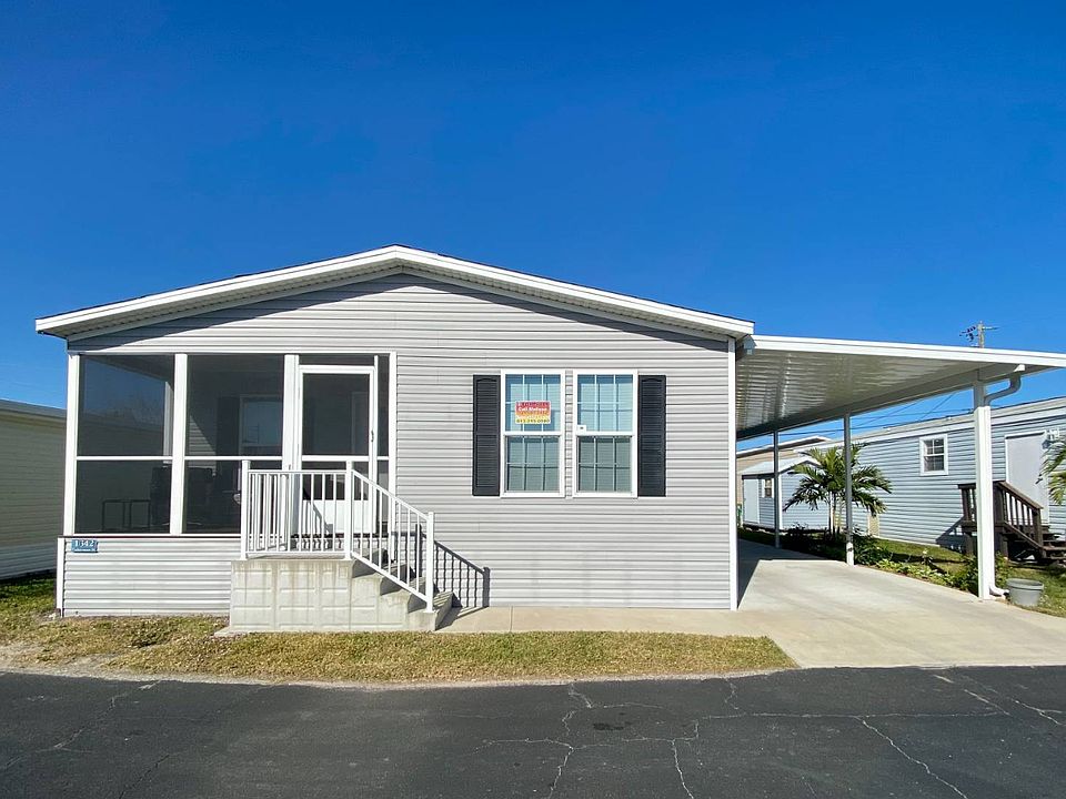 This is a BEAUTIFUL 3/ 2 2018 Champion Homes of Merit Manufactured home with Stainless Steel appliances, Off street and covered parking, storage shed, front screened porch ! It sits on leased land in Merritt Island Village. The park is a 55+ adult community with Low lot rent of just $435 /month including water (3kg), sewer, trash/recycle pickup, and basic lawn care. 1 small animal under 25lb permitted with park approval. RV/ Boat parking available, check with management. No motorcycles permitted. FEATURES: - Great location, near Cape Canaveral cruise terminals, Cocoa Beach, Kennedy Space Center, shopping, dining - Covered parking, paved driveway, gutters , ADDED landscaping with palms and flower bed. - NEWER home with newer Whirlpool kitchen appliances AND black stainless steel washer /dryer front loaders with steam and stack kit. - Granite Farmhouse sink added with goose-neck faucet . - Nice spacious shed with plenty of storage room, electricity and outlets added with own breaker - Screened front porch to relax or quiet space interior of carport. - FULL bed, sealy 16" pillowtop mattress with full platform bed frame (NEVER used), cooling mattress pad and sheets can remain - Walk in closets WITH added specialty CUSTOM barn doors - 4 Ceiling fans - All window treatments remain , blinds and black out curtains upon request. All listing information is deemed reliable but not guaranteed and should be independently verified through personal inspection by appropriate professionals. We do not and cannot guarantee or warrant the accuracy of this information or condition of this property. Measurements are approximate. The buyer assumes full responsibility for obtaining all current rates of lot rent, fees, and pass-on costs. Additionally, the buyer is responsible for obtaining all rules, regulations, pet policies, etc., associated with the community, park, or home from the community/park manager. We are not responsible for quoting said fees or policies. Financing is available through 3rd party lenders. Please contact us for additional information.
