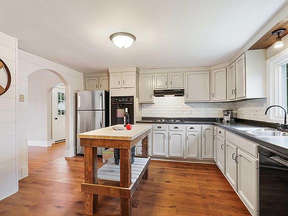 Welcome to your Country Kitchen! Move right in to this beautifully remodeled 1 1/2 story, 4 bedroom traditional T-shaped farmhouse design! Features a farmhouse-style kitchen with shiplap walls and barnwood accents, new stainless refrigerator,7'' oak plank flooring, and a magnificent custom-made beam island. Updated bath with new tub/shower, vanity, and toilet. Fresh finish on original oak floors in the spacious dining and living rooms. Painted from head to toe with new doors inside and out. Basement has a new drain tile system. Spacious yard- plenty of room to build a garage if you want one