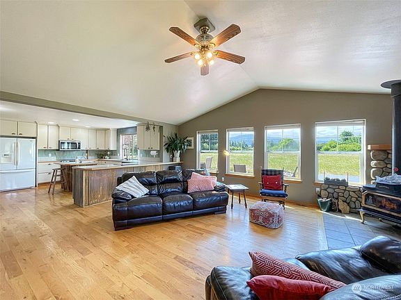 Charming home with income potential. This 1 ½ story home has 5 BR, 2 offices, and 5 BA on 2.54 acres. 3,787 SF includes two attached apartments with a living room, kitchenette, BR, & BA; great for renting out or posting on VRBO or AirBnb. The great room has a vaulted ceiling with a fan & wood stove. The dining room is off of the spacious kitchen that has an island with a 2nd sink & also sports a breakfast bar & walk-in pantry. Enjoy the mountain view from inside the house or from the large deck. There are established apple trees. The fenced-in backyard has a play set & an additional fenced-in area for goats or other small animals. Garage has a shop area, RV carport, & a loft. This amazing property is close to town & Railroad Bridge Park.