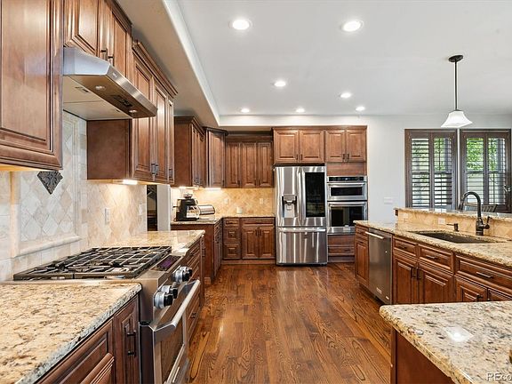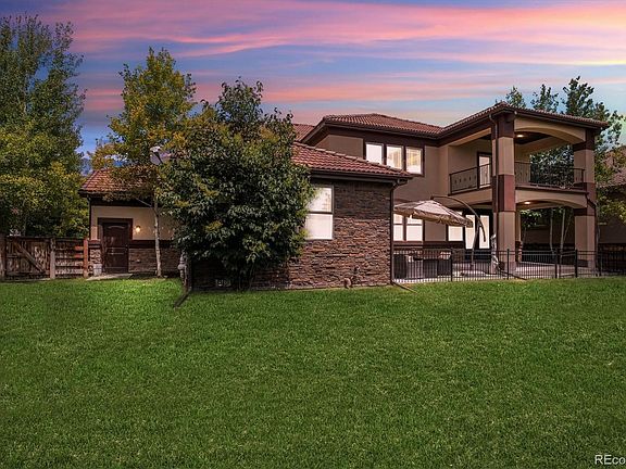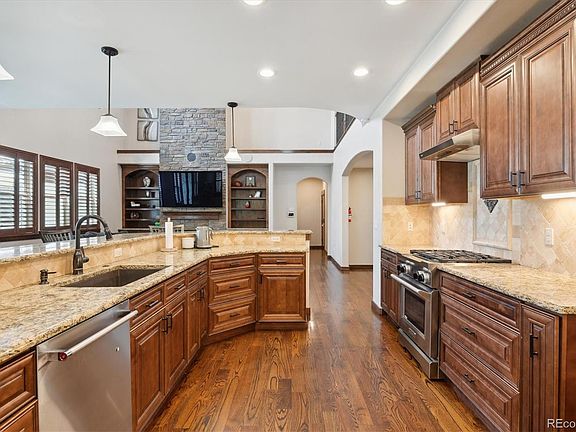 This beautiful Traditional European style home in sought-after Reunion offers luxurious finishes, a spacious layout and timeless classic design. Upon entry you will be greeted by a grand foyer with a wrought-iron staircase, tall ceilings, and endless natural light. The well-appointed kitchen boasts beautiful wood cabinetry, a Kitchen Aid stainless steel appliance package, pantry, an oversized center island and granite counters. The kitchen opens to the spacious family room with a stone fireplace that acts as the focal point to the room. A main floor mother-in-law suite is also equipped to be a primary bedroom if desired. Walk-in closet and ensuite 5-piece bath with jetted tub is ideal for a multi-generational family or for hosting guests. The secondary primary suite is located upstairs, complete with a fireplace and sitting area, walk-in closets with custom built-ins, ensuite 5-piece baths, and a private covered balcony – the perfect spot for a morning cup of coffee. Three spacious secondary bedrooms, two bathrooms, additional patio, and laundry round out the upper floor. The recently finished lower level is over 2,000 sqft and provides additional entertaining space with a large media room that includes a heavily upgraded wet bar. A craft/bonus room with tons of built-in shelving and Catio, additional bedrooms, a 5th bathroom and even a dog washing station completes this well-equipped basement. The spacious covered patio outside will be the ideal spot for al fresco dining or entertaining friends and family overlooking low-maintenance mature landscaping and a relaxing water feature. Smart home technology including lights, locks, HVAC, and security system all installed. Situated on a large lot within minutes of Reunion Park, Buffalo Run golf course, DIA, shopping, dining and more, 16420 Fairway Drive truly offers the ultimate in Colorado living. Interactive floorplan, video tours and additional photos available at https://bit.ly/3XV9Eql