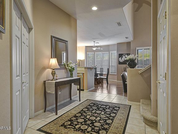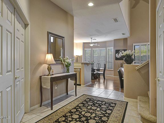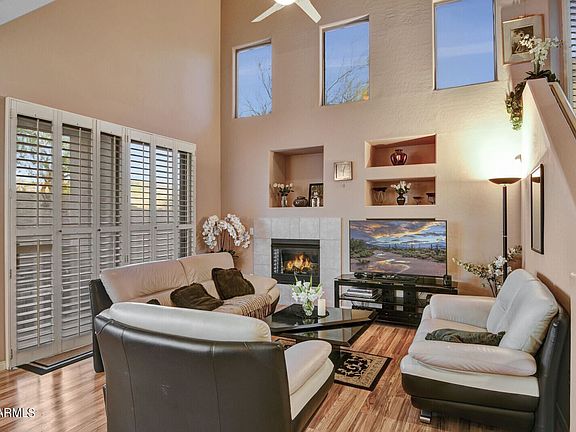 Located in a beautiful gated community at the base of the McDowell Mountains with unobstructed views. This property offers an open floor plan with high ceilings, two bedrooms upstairs, the master suite (with a walk in closet and balcony) and the guest ensuite, half bath and a separate office/den downstairs, attached two car garage, gas fireplace in living room, new stainless steel appliances were installed last year (including the refrigerator) laundry room with front loading Bosch washer and dryer. Neutral colors throughout with laminate and tile on first level and carpet in bedrooms. Enjoy all that The McDowell Mountain Ranch community offers. Heated Pool and Spa, Tennis courts, pickleball, parks, clubhouse, walking trails, workout facility and more. The property is walking distance to