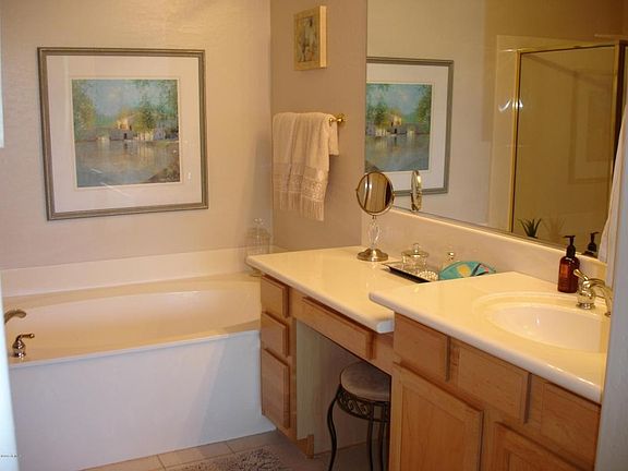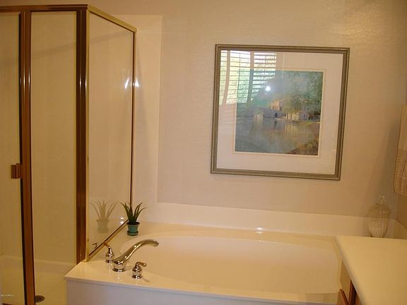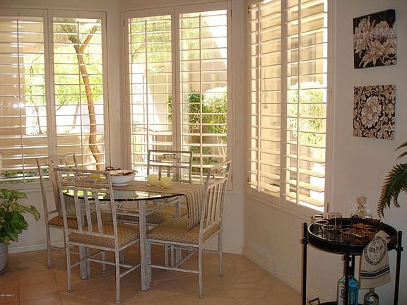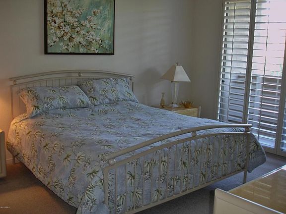 This enchanting completely furnished, barely lived in Monarch model, one-story home in a gated subdivision is ready for you and your suitcases. Spacious split floor plan, gas fireplace, two bedrooms plus den. The private secluded rear covered patio backs to the common area with no neighbors behind. Walk to the heated community pool and spa, which sports a complete gym, meeting room for your private parties, BBQ grills, plenty of sitting/lounging area, outdoor shower, restrooms. Plantation shutters throughout, security door to let the cool breezes in, garage epoxy floor, HVAC replaced Oct. 2014 and water heater replaced Jan 2015, Water softener installed two years ago. Both bedrooms have spacious walk-in California closets, Located minutes to shopping, dining, entertainment.